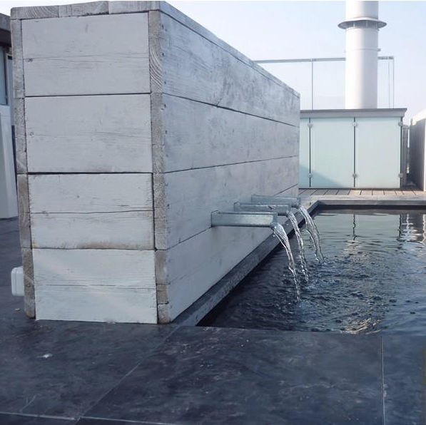 Daktuin Almere. Aan de Veerkade in Almere hebben wij deze prachtige daktuin aangelegd. Als basis ligt er een hardhouten vlonder van 100m2. Om de druk te verdelen zijn de balken geplaatst op rubberen stelblokjes. Op de balken zijn hardhouten planken geschroefd met rvs schroeven. Op de randen rondom het terras zijn natuurstenen gelijmd. De siervijver is een roestvrijstalen waterbak met rvs spuwertjes. In de vijver is ook onderwater verlichting aangebracht voor een mooie sfeer op een donkere zomer avond. De waterpompen en leidingen zijn weggewerkt in een hardhouten wand. Voor een robuuste uitstraling op het dakterras hebben wij ook de rand van de vijver voorzien van natuursteen. De liftschacht duidelijk te zien op de laatste foto is voorzien van natuursteen en vetplanten De Loungebank is door ons op maat gemaakt en op verzoek geschilderd. In de boombakken zijn perenbomen gepland met daaronder Lavendel struiken voor een heerlijke geur.