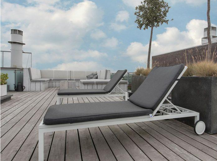 Daktuin Almere. Aan de Veerkade in Almere hebben wij deze prachtige daktuin aangelegd. Als basis ligt er een hardhouten vlonder van 100m2. Om de druk te verdelen zijn de balken geplaatst op rubberen stelblokjes. Op de balken zijn hardhouten planken geschroefd met rvs schroeven. Op de randen rondom het terras zijn natuurstenen gelijmd. De siervijver is een roestvrijstalen waterbak met rvs spuwertjes. In de vijver is ook onderwater verlichting aangebracht voor een mooie sfeer op een donkere zomer avond. De waterpompen en leidingen zijn weggewerkt in een hardhouten wand. Voor een robuuste uitstraling op het dakterras hebben wij ook de rand van de vijver voorzien van natuursteen. De liftschacht duidelijk te zien op de laatste foto is voorzien van natuursteen en vetplanten De Loungebank is door ons op maat gemaakt en op verzoek geschilderd. In de boombakken zijn perenbomen gepland met daaronder Lavendel struiken voor een heerlijke geur.